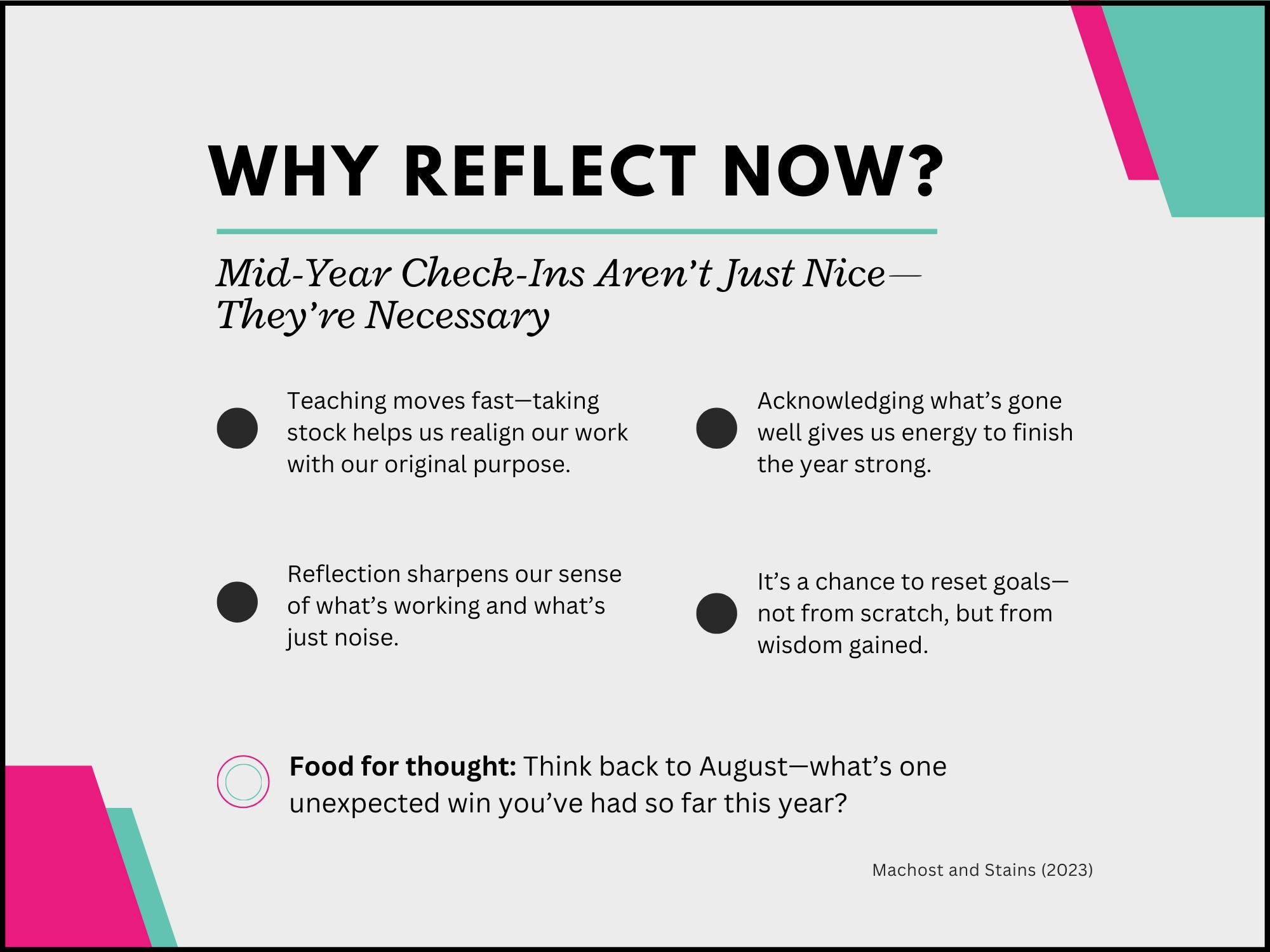 This week, we’re inviting teachers to pause—not to power down, but to reflect with purpose. Mid-year can feel like a blur of grading, routines, and to-do lists. But taking just a moment to notice what’s working, where we’ve grown, and what needs a gentle reset can bring clarity and momentum. Reflection isn’t about perfection—it’s about insight. This week’s resource offers bite-sized prompts and tools to help teachers realign their practice and finish the semester strong. Because a small pause now can lead to a stronger, steadier second half.