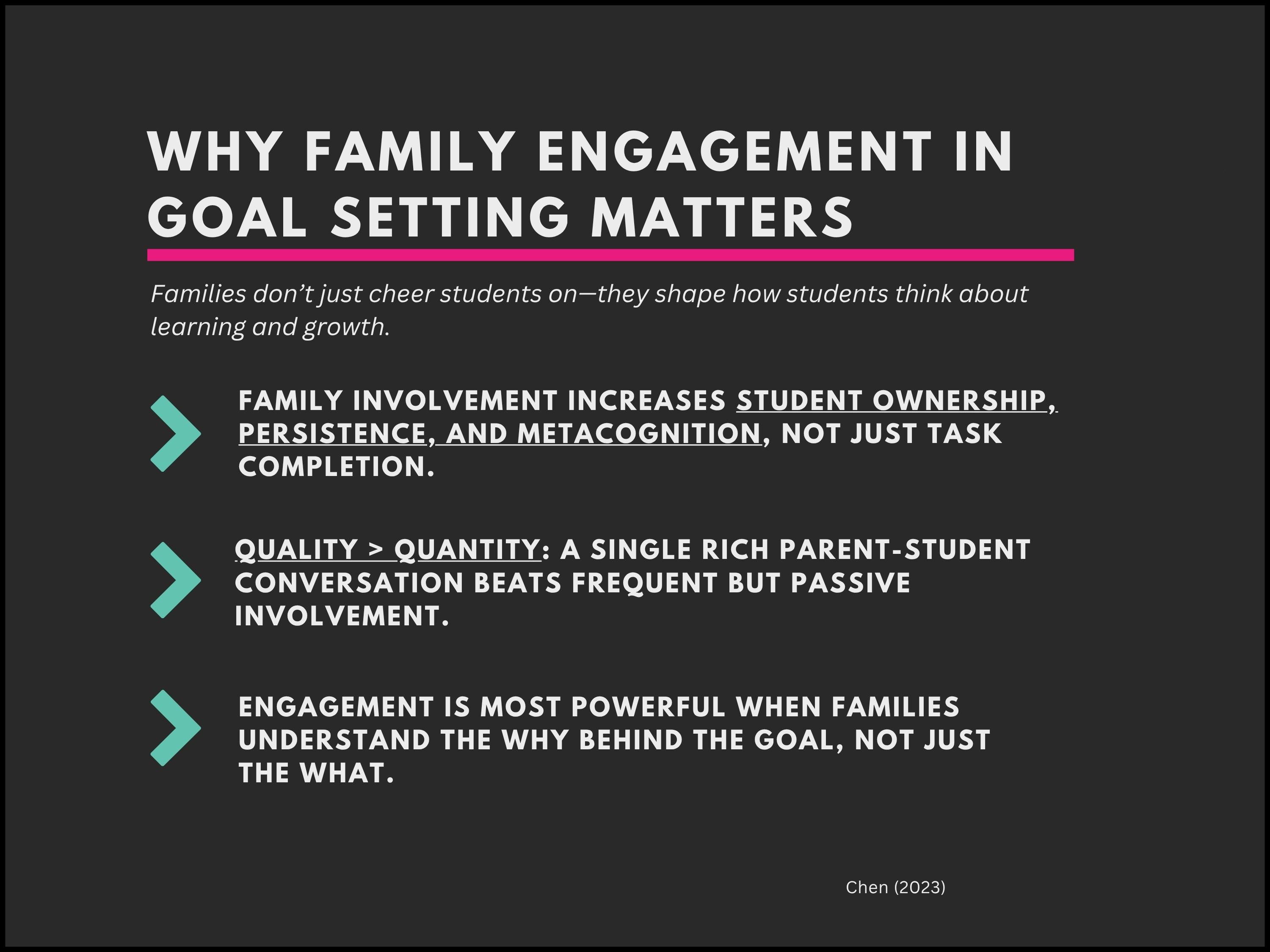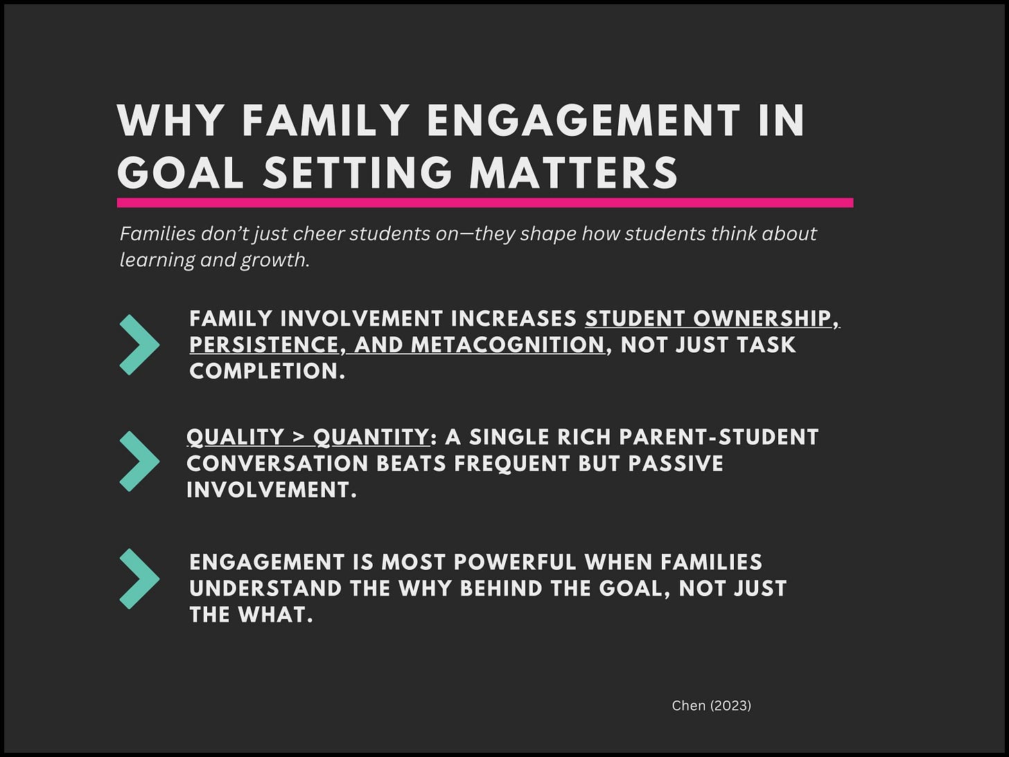 This week, we’re focusing on one of the most underused drivers of student growth: partnering with families in goal setting. When we invite families into the process—not just to hear the goals, but to help shape them—we create clarity, consistency, and motivation that carry far beyond the classroom. By co-designing goals, sharing simple tools for support, and keeping communication light but meaningful, we help students see that everyone in their world is on the same team. This kind of authentic collaboration doesn’t just improve achievement—it builds ownership, agency, and long-term success. Let’s lean into partnership this week and make student goals a shared mission.