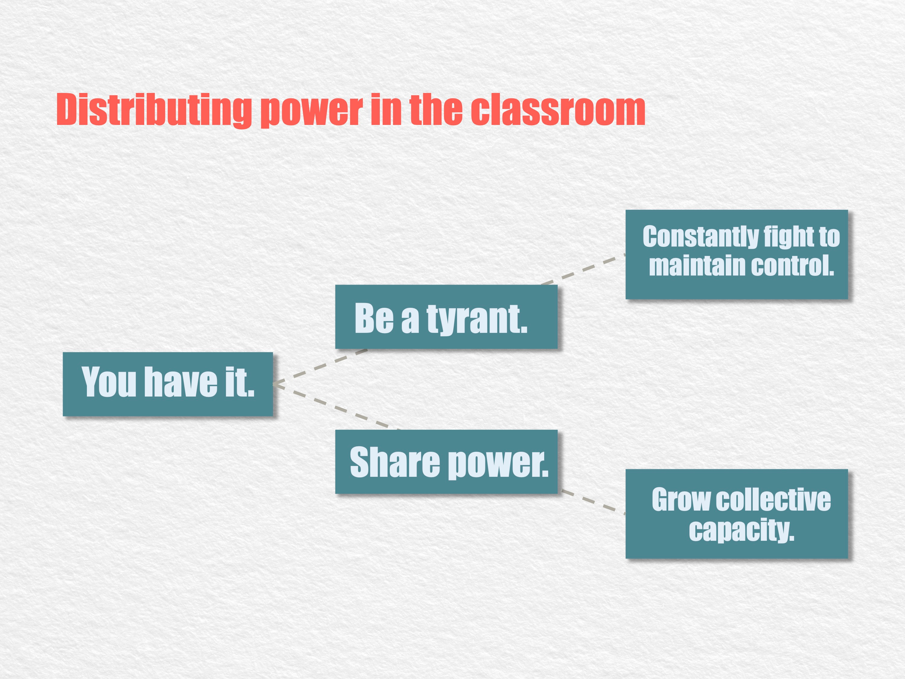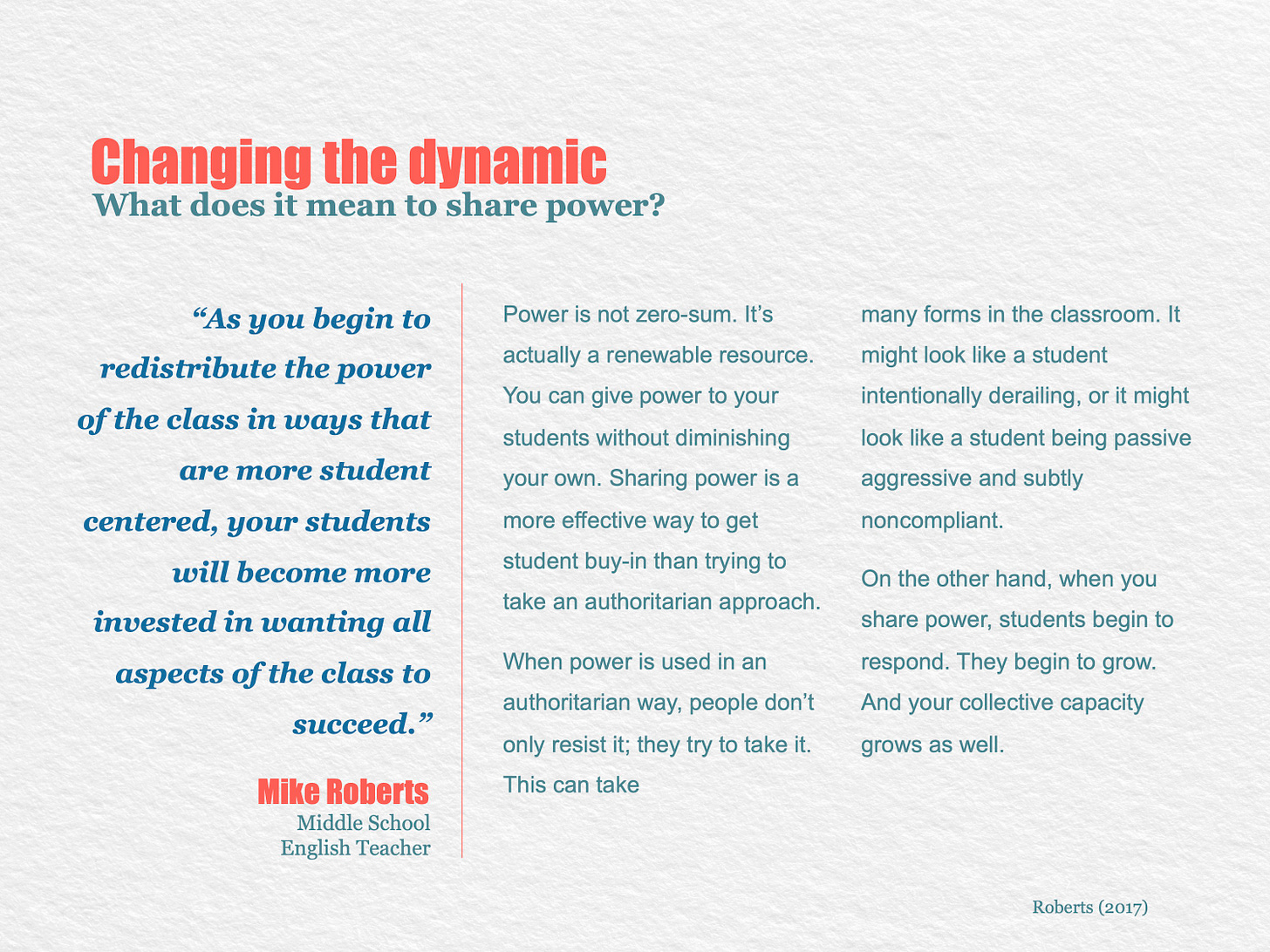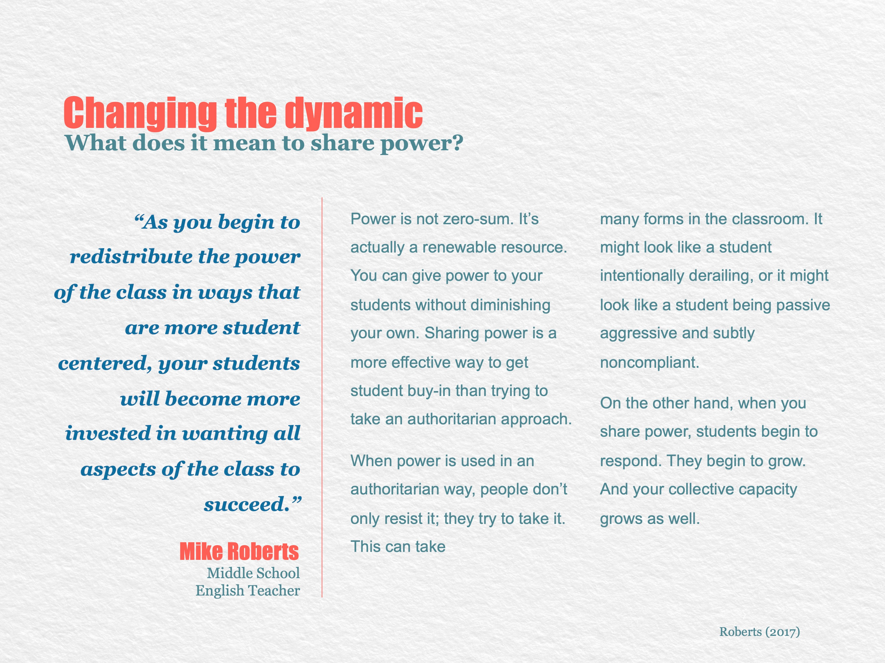 As we continue to discuss the importance of relationships in the classroom, I wanted to incorporate some thoughts from one of my favorite teacher/authors Mike Roberts. He often discusses the idea of sharing power in the classroom. It’s critical that teachers feel confident redistributing some power to their students. Of course, this comes after building the appropriate structure, which we discussed in detail at the beginning of the year.