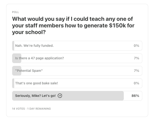 On an unrelated note, I was encouraged to see that many folks would like to hear more about generating some (relatively) easy money for your buildings. I’ll pull back the curtain on this closer to the summer. It’s something I’ve done at my school and have been wondering why it’s not done everywhere.