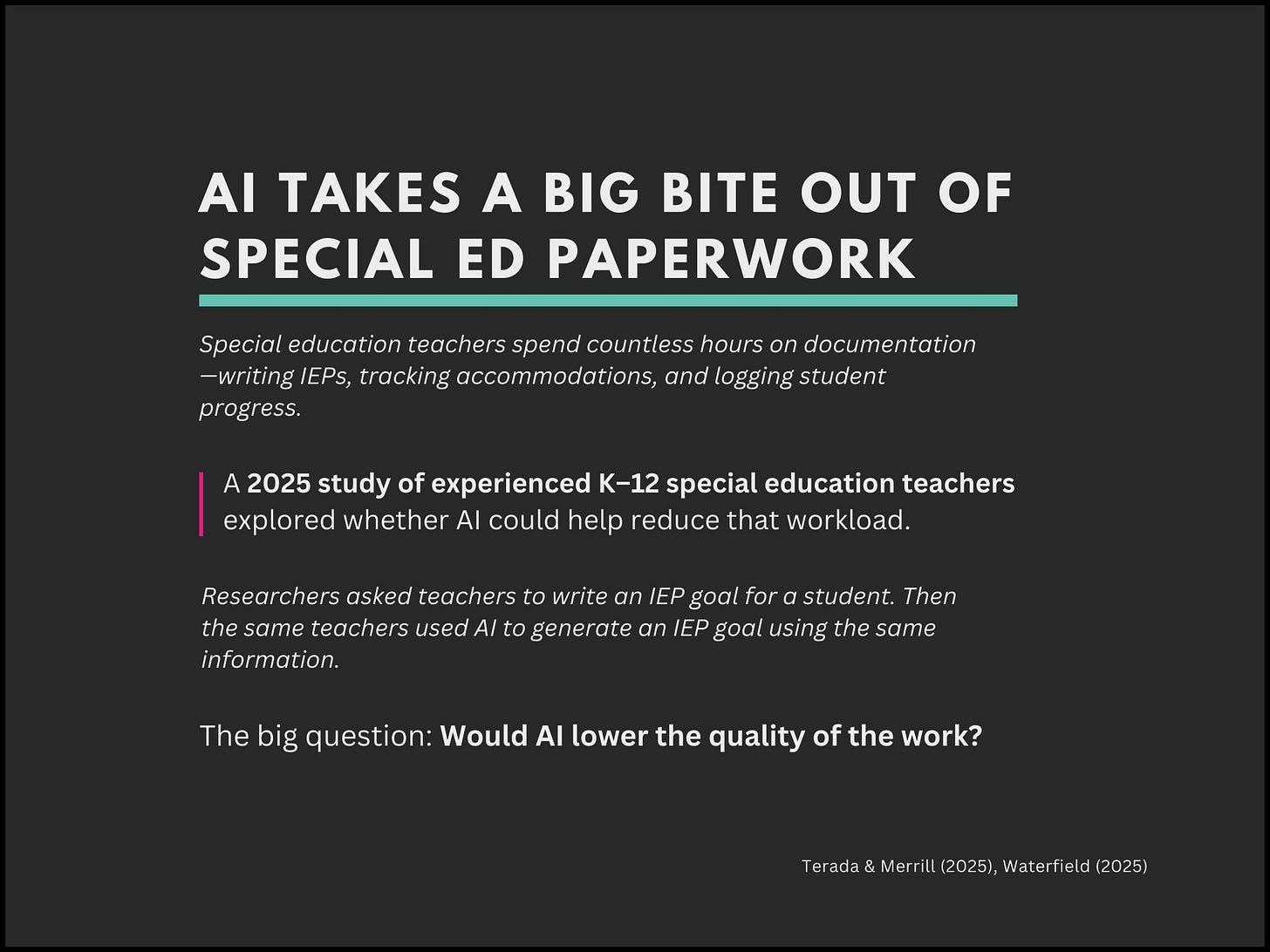 This week’s research explores how AI tools may help ease that burden, showing that AI-generated IEP goals can match the quality of those written by experienced teachers while saving time.