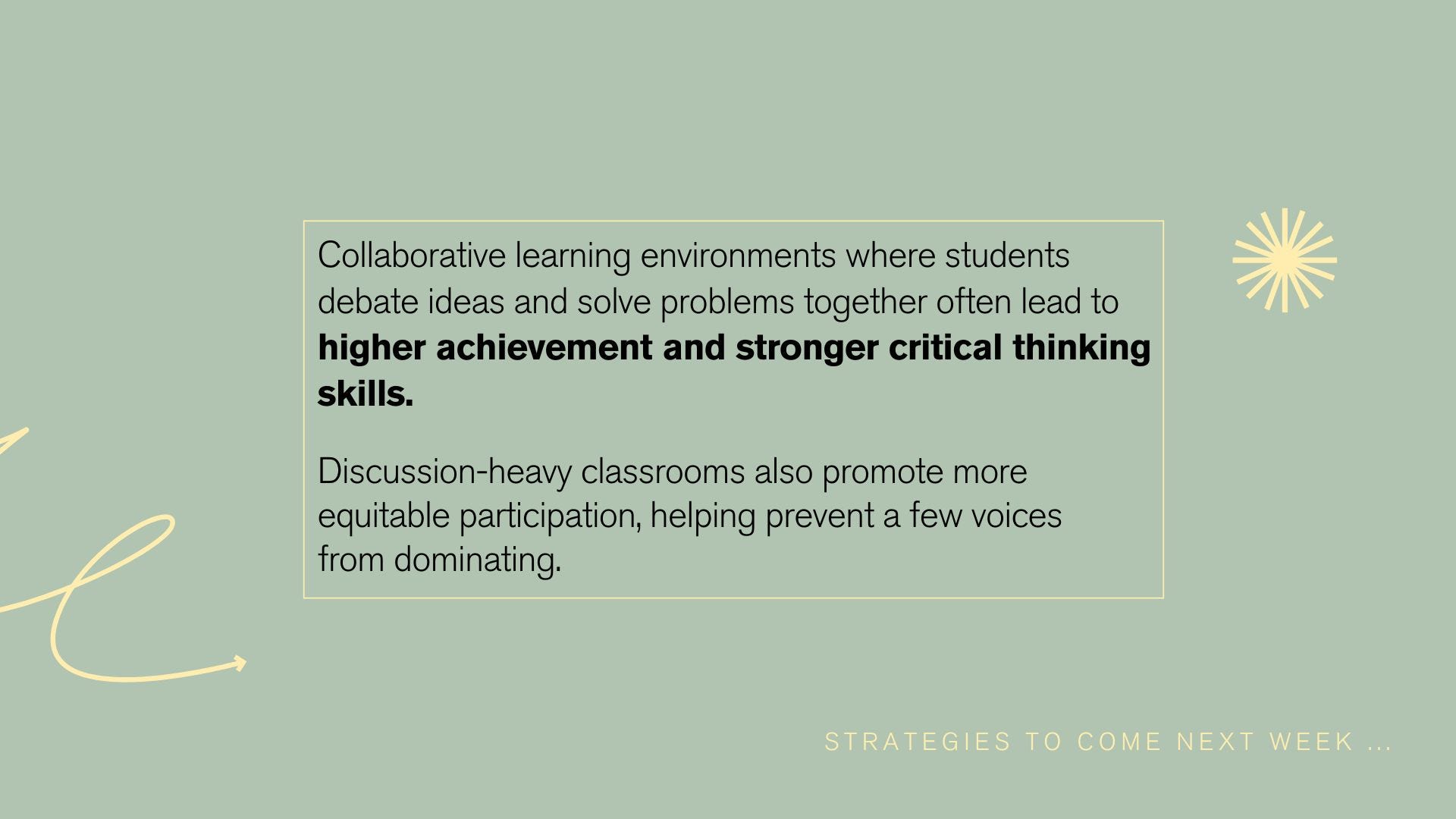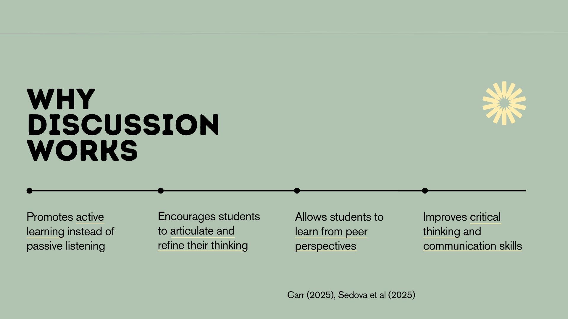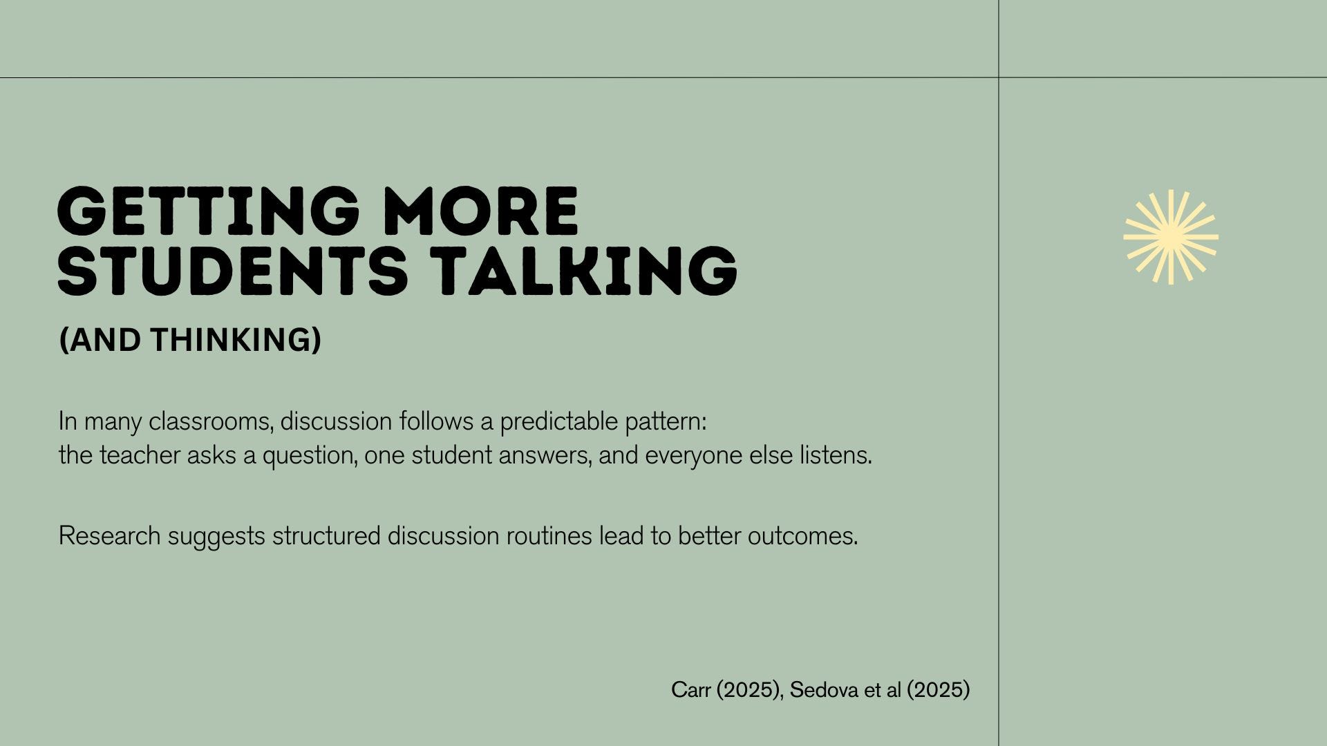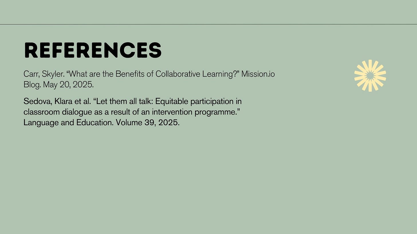 I got a touch of feedback that the PDFs were getting a bit dense. They always do balloon a bit during the research segment, but if it’s too much for your teachers to digest, then it defeats the purpose. This week, we’re simplifying things a bit. The goal is to split dense topics (like this week’s focus of Structured Discussion) into multiple parts while keeping the slides quite minimal.